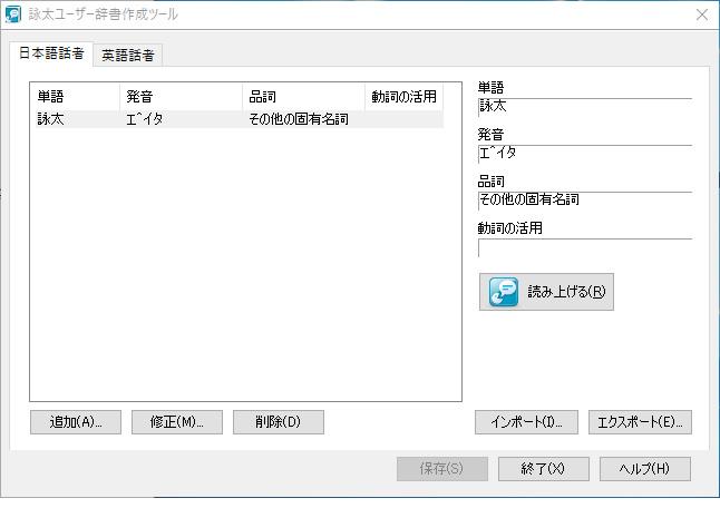 - 言語と話者を選択してください。詠太16には、日本語のRISA/ERICA/AKIRA/TAKERUと、アメリカ英語のJULIEを搭載しています。