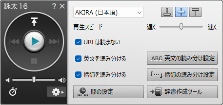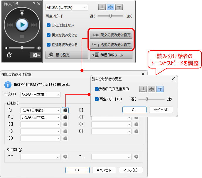 詠太16では、この読み分け機能を強化し、読み分けする話者の再生スピードと声のトーン(高低)を個別に調整できるようになりました。