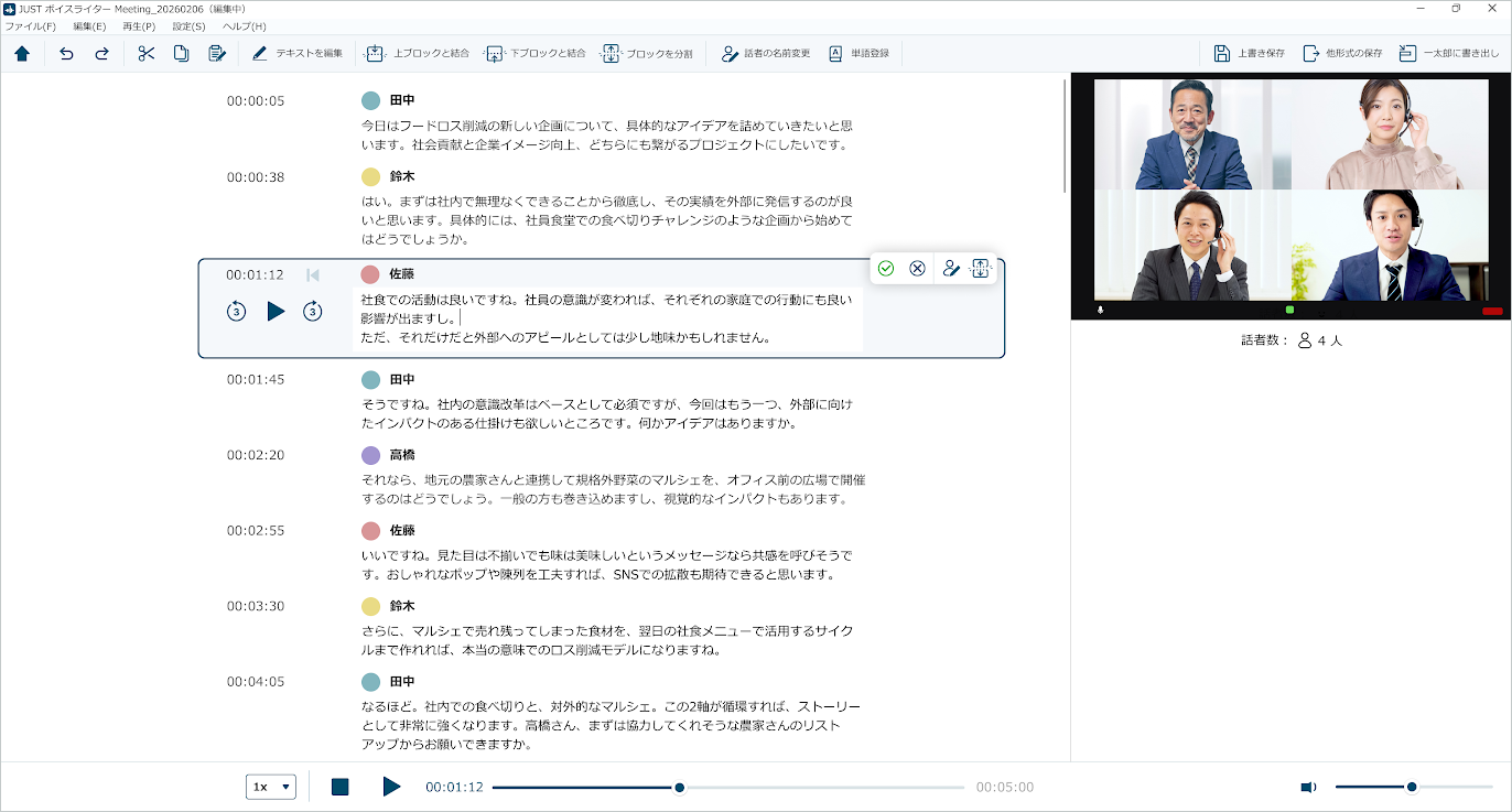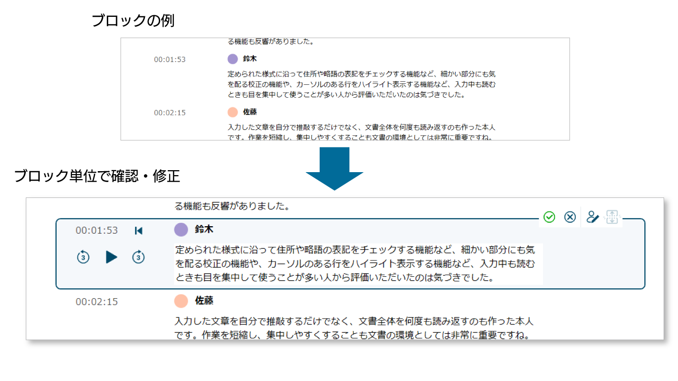 文字の修正は、経過時間と話者情報(アイコンと名前)、発話内容がひとまとまりとなった「ブロック」ごとに行います。