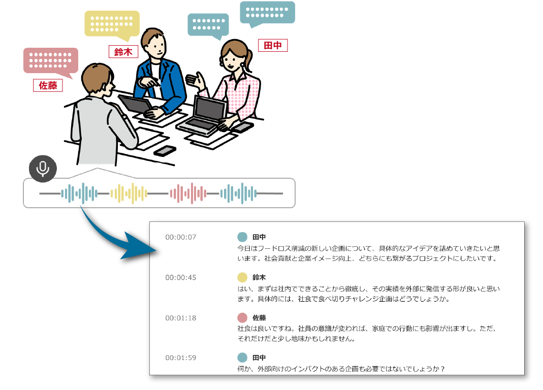 数人が話している音声は、[話者の識別]をオンにすると、「誰がどの部分を話しているのか」を自動で判別し、話者情報を付加した形で文字起こし結果を出力します。