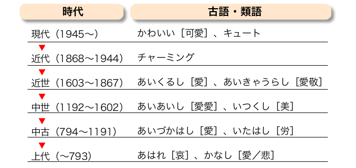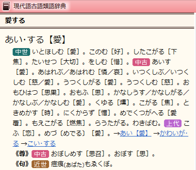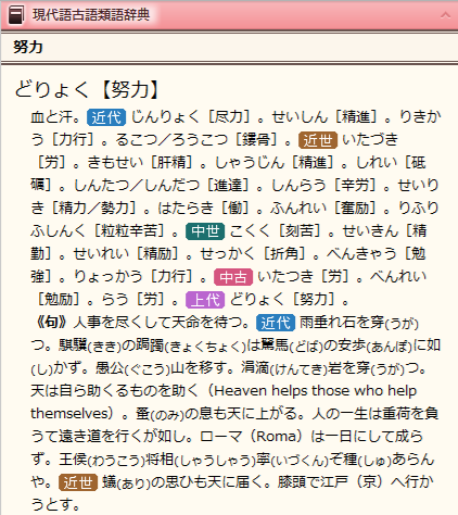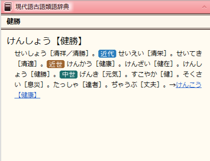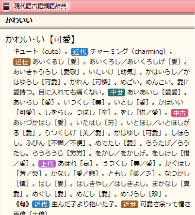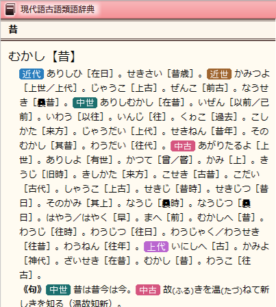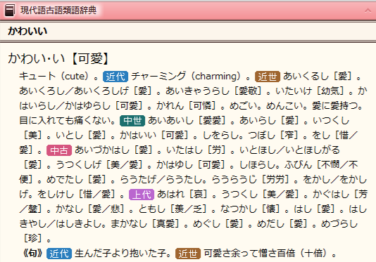 約2万1,000語の現代語を見出しとして、関連する古語や類語を引くことができるため、現代の言葉に対応する昔の表現を容易に探すことが可能です。また、用例が存在した時代ごとに整理されており、時代による言葉の変遷をたどることができます。
