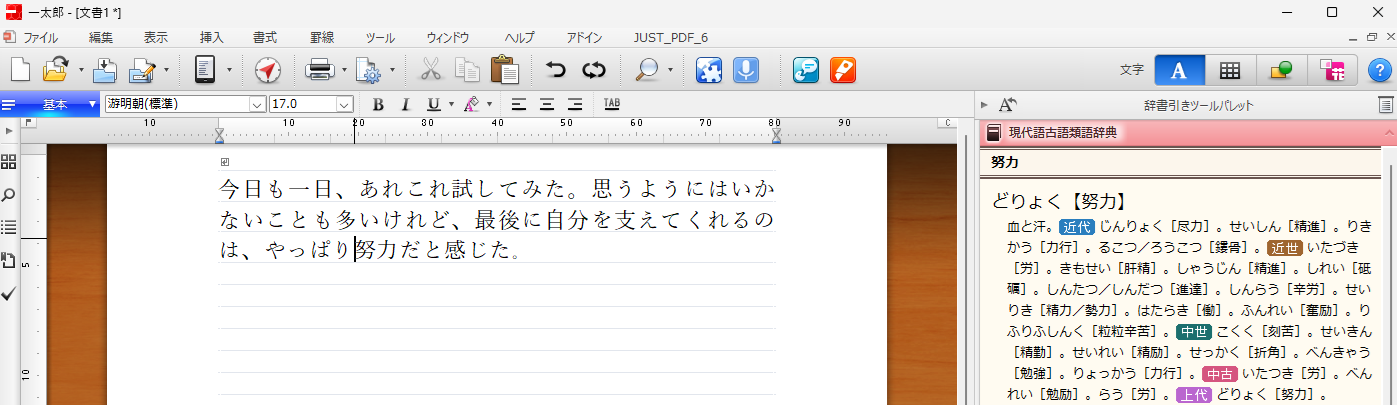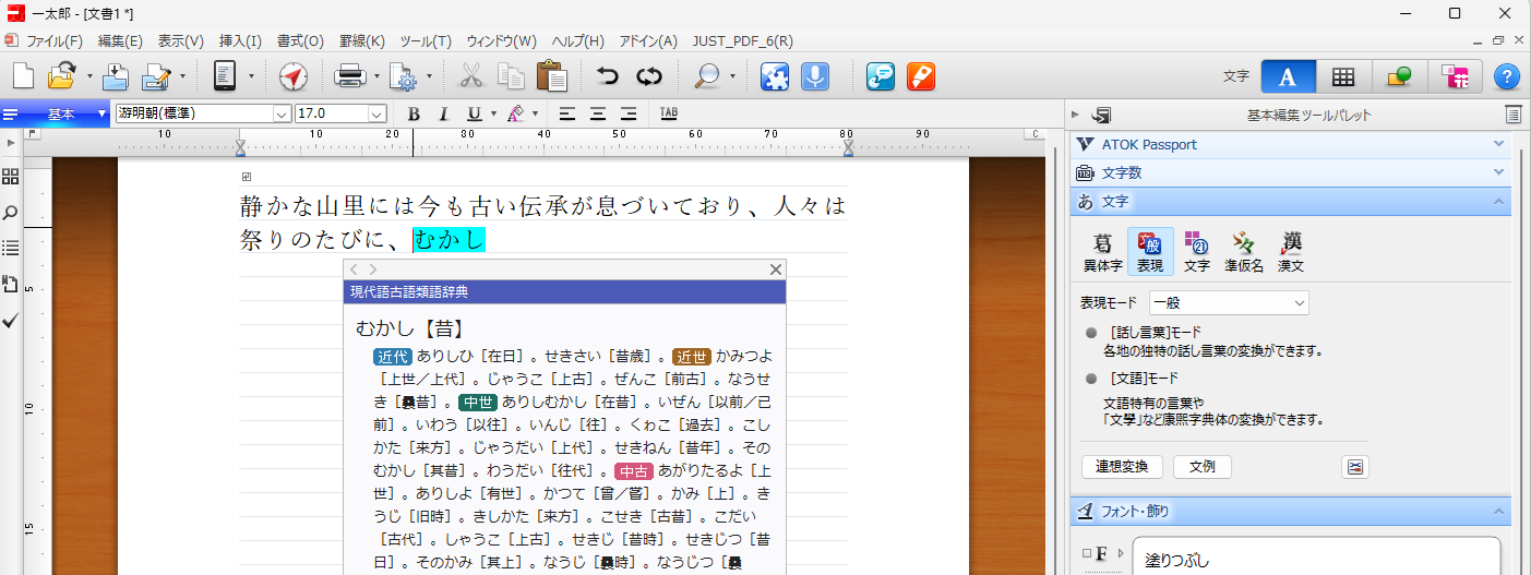 この『現代語古語類語辞典』が、今回初のデジタル版*1として「一太郎2026 プラチナ」に搭載されます。