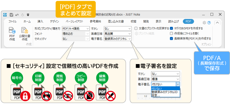 JUST Office 6 Personalでは、PDFソフト「JUST PDF」と連携し、専用の[PDF]タブからセキュリティ設定や電子署名などをまとめて設定して、かんたんにPDFを作成できます。