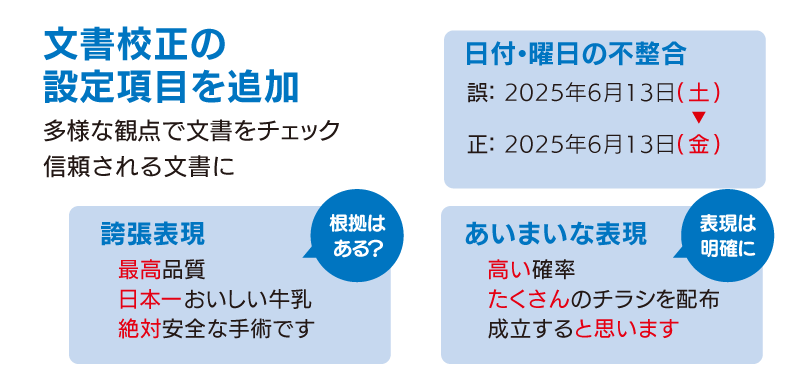 新たに文書校正で誇張表現、日付・曜日の誤り、あいまいな表現のチェックが可能になりました。