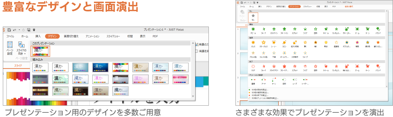多彩なテンプレート、テーマ(配色・フォントなど)を収録。画面切り替えや細かく設定できるアニメーション効果も豊富に用意されており、効果的なプレゼンを演出します。