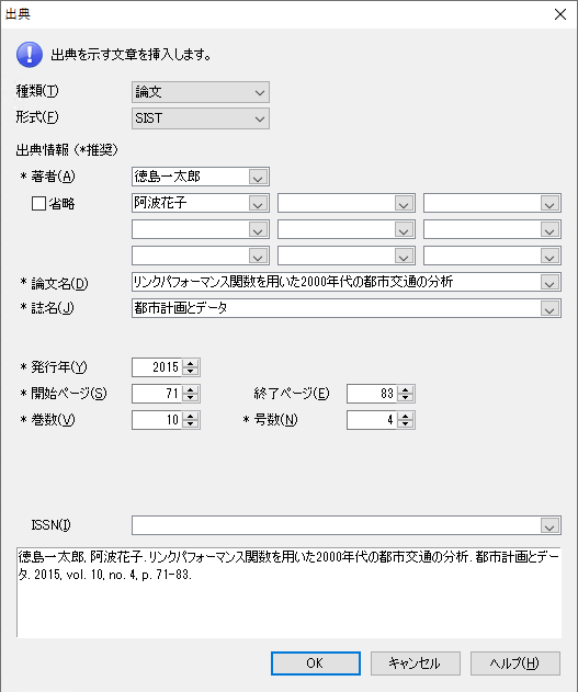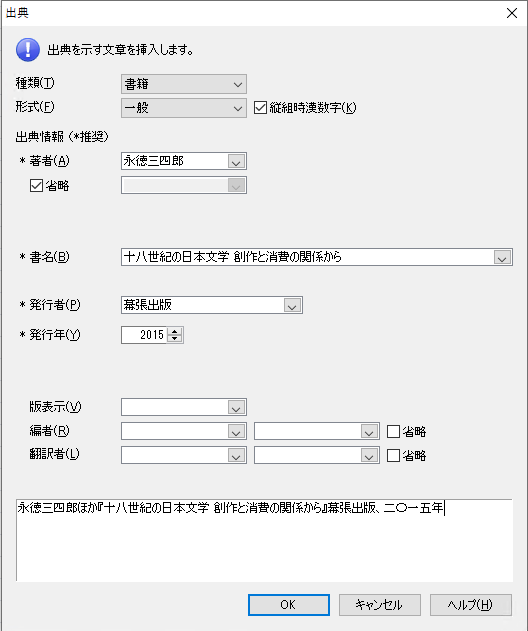 書名や著者、発行年などの必要な項目を入力し、形式を指定すると、自動的に整形された形で文書に挿入できます。