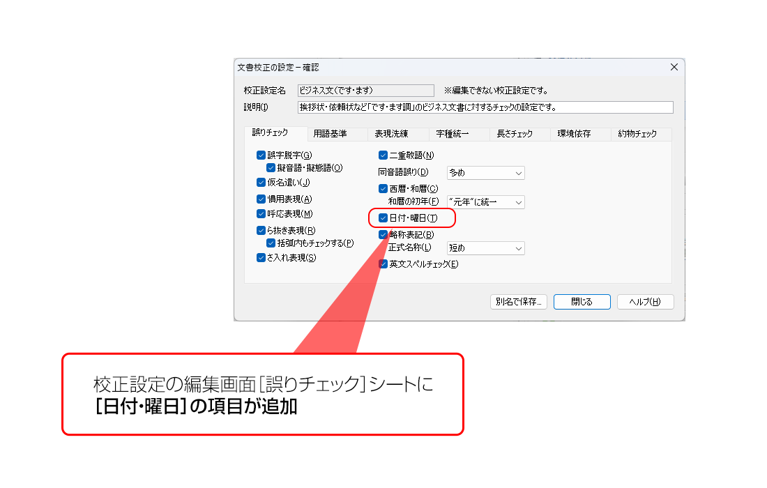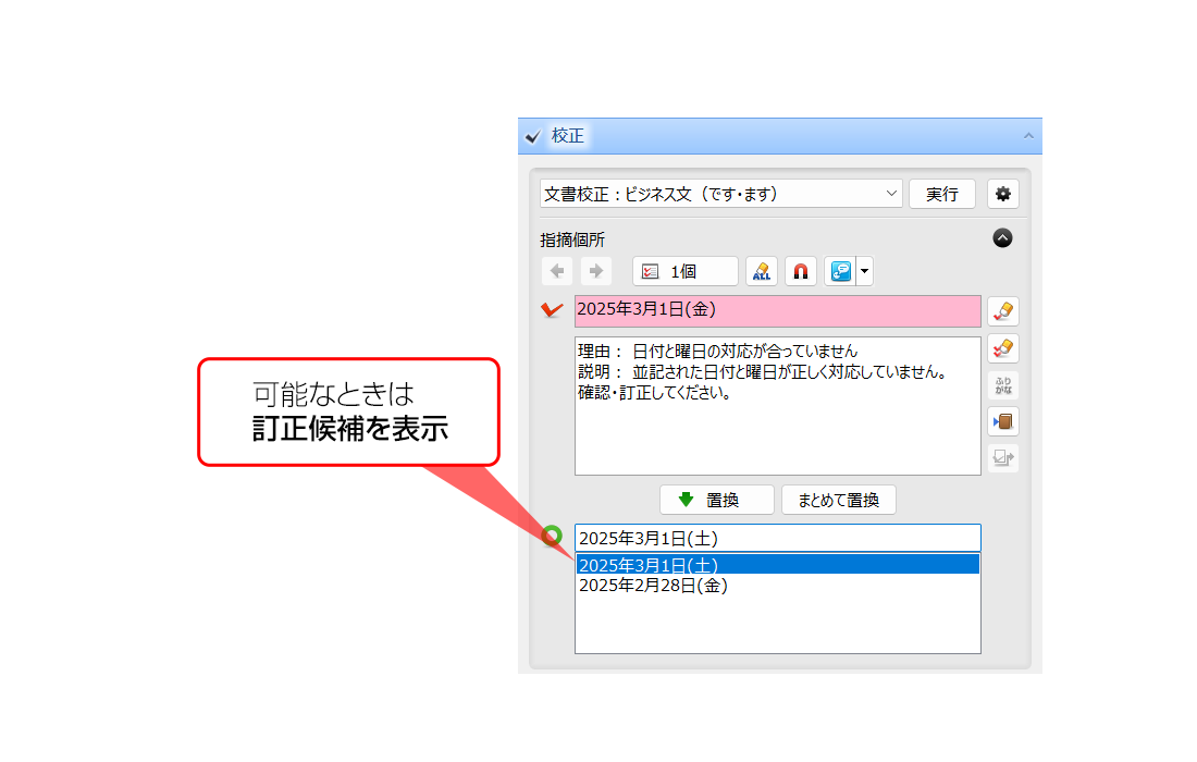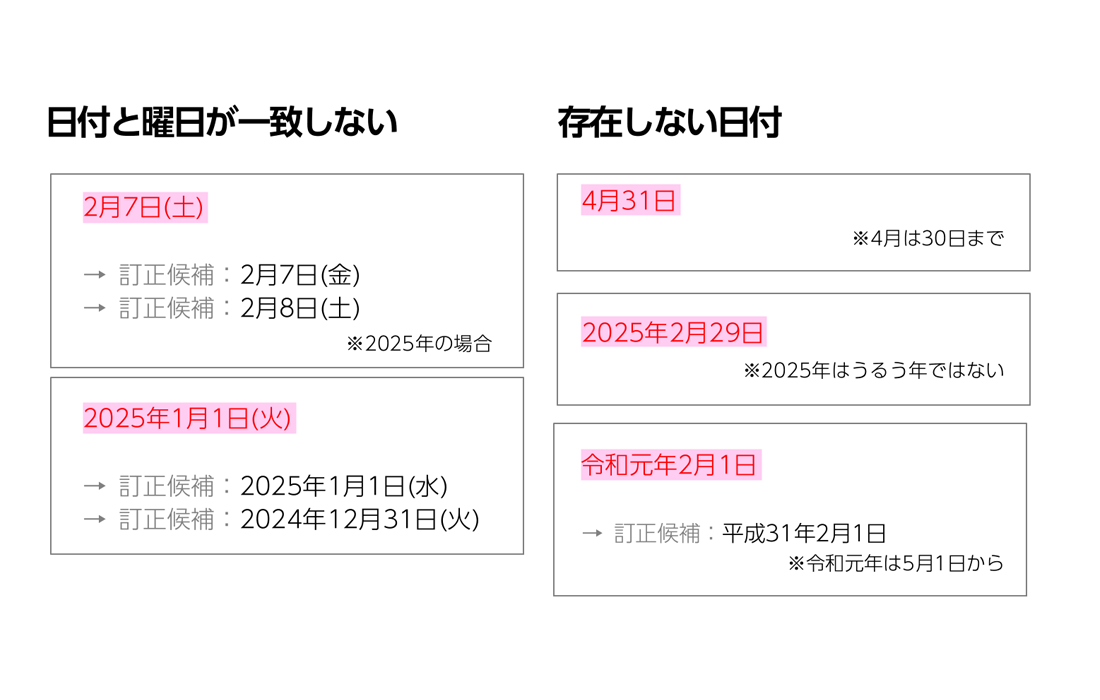 チラシやイベントなどに日付を記載するとき、日付と曜日を誤ると読み手に正しく伝わらないトラブルを招いてしまいます。一太郎の文書校正は、日付と曜日の不整合や存在しない日付をチェックする機能を搭載しています。