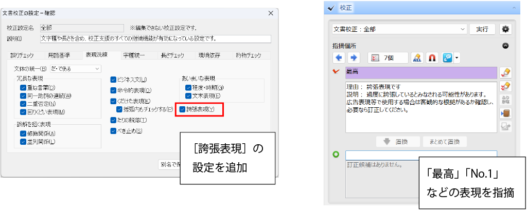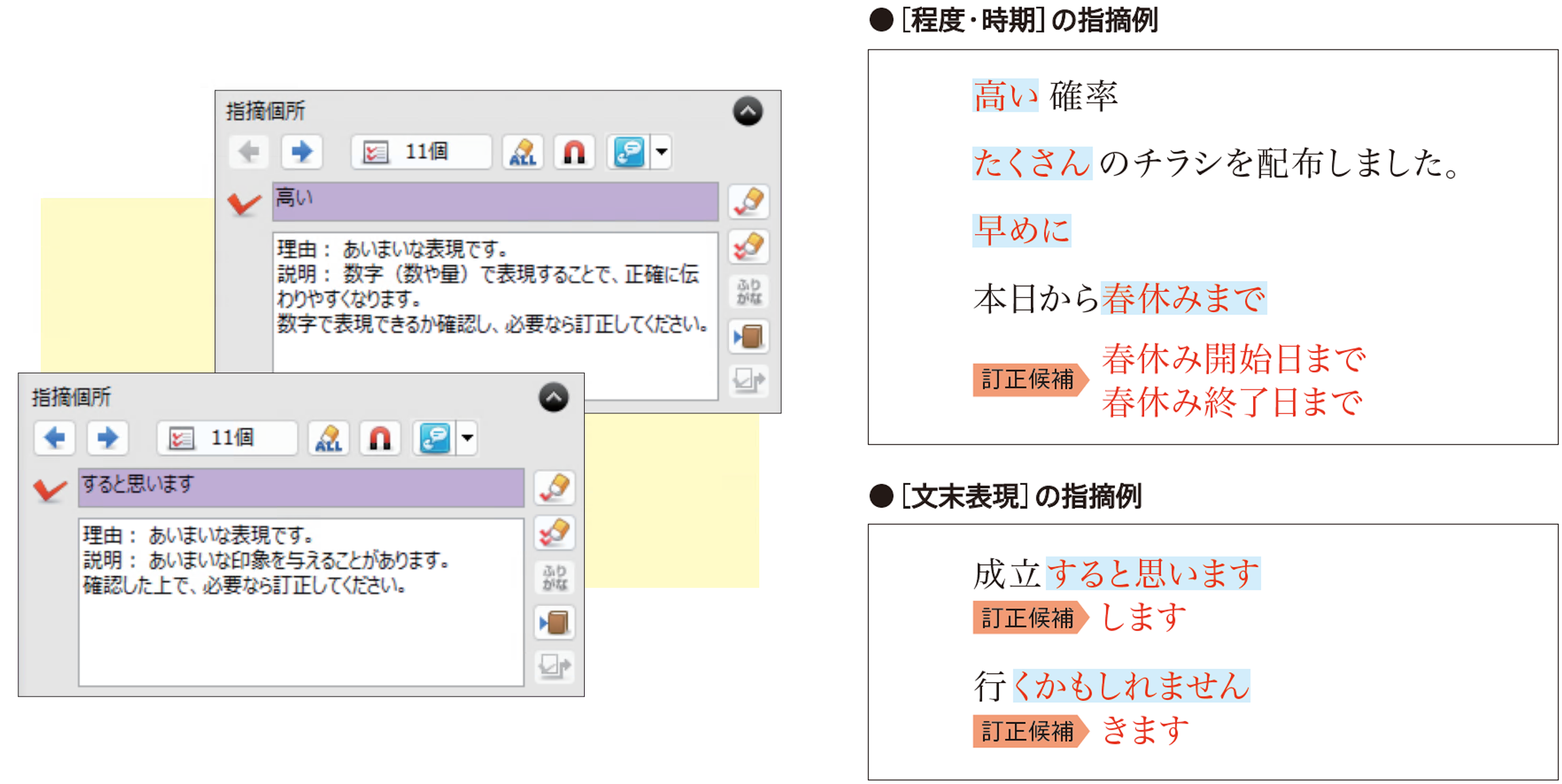 大げさ、紛らわしい表現も指摘する、文書校正機能