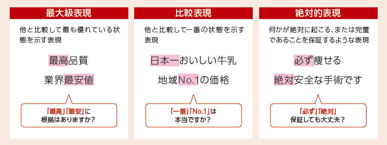 文書にインパクトをもたらす「日本一」「世界初」「最高」などの文言は、つい使いたくなりますが、客観的な根拠がない場合にリスクとなりうる表現です。
