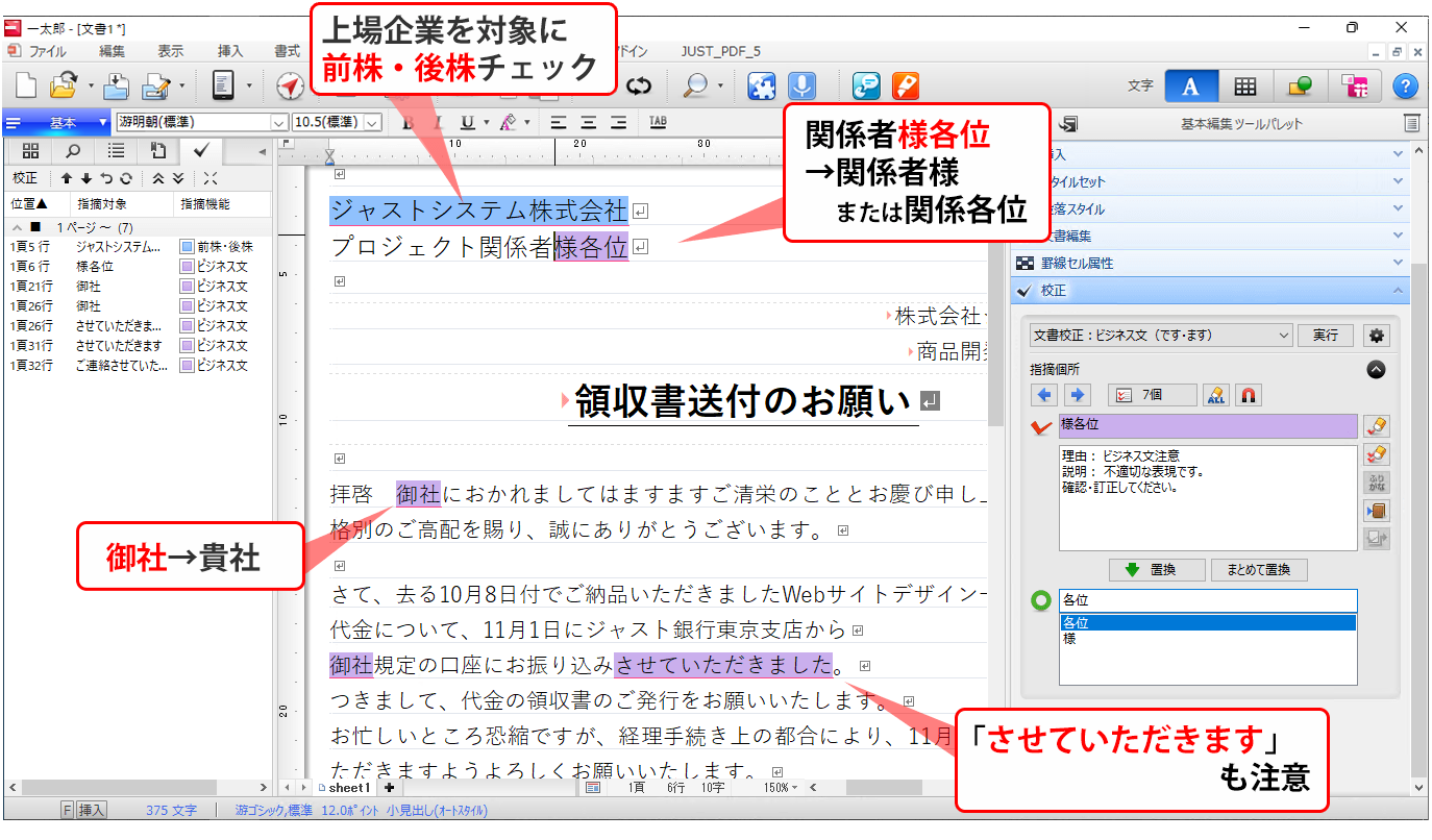文書校正設定「ビジネス文」では、「関係者様各位」など、ありがちで出てきやすいミスのほか、「させていただきます」など多用しがちな表現も指摘。相手先へ送る文書や公開文書などに残ってしまうトラブルを未然に防ぎます。