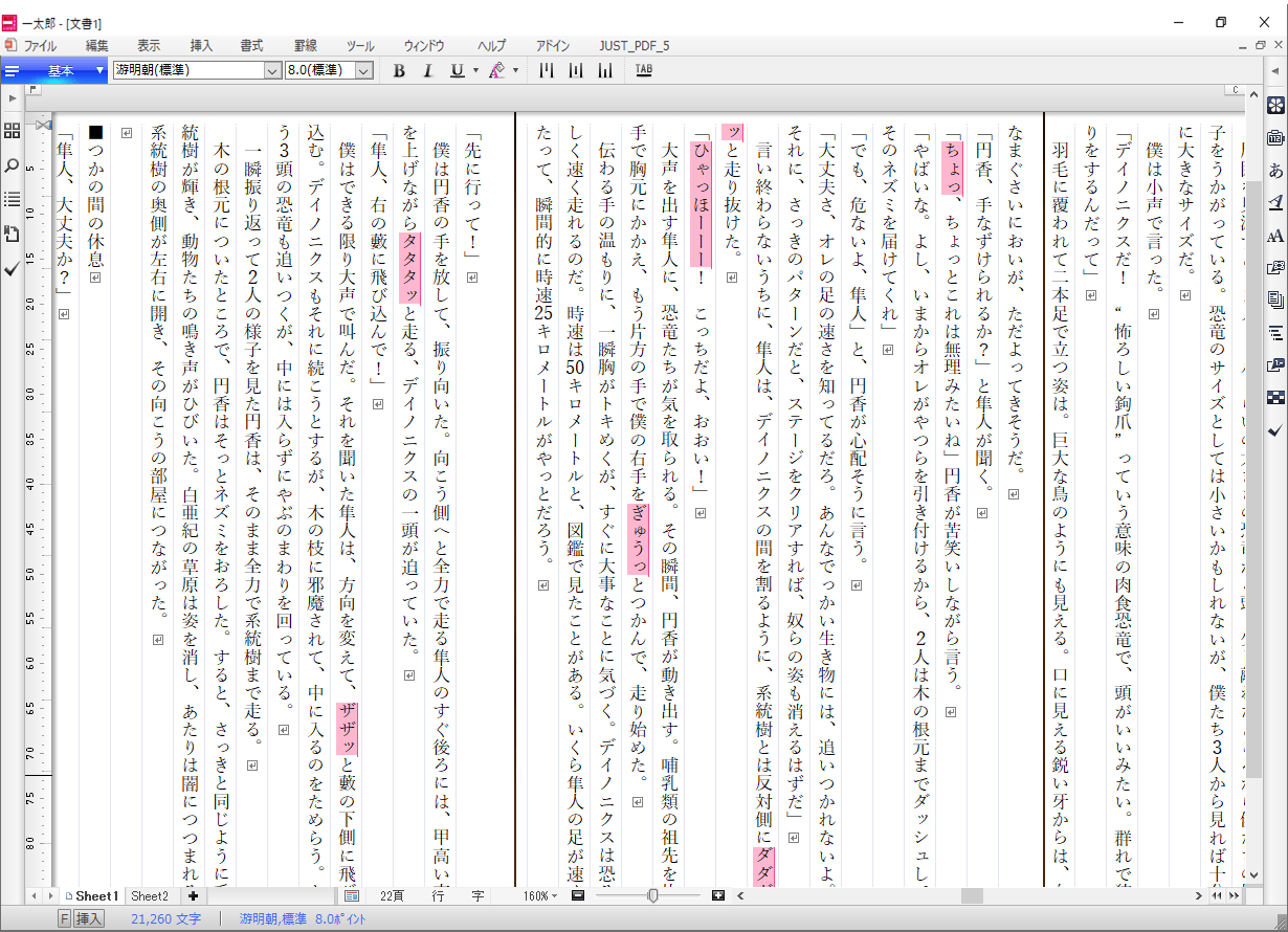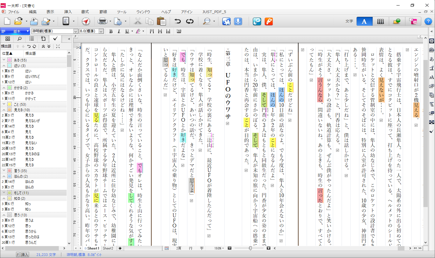小説のジャンルや書き手のスタイルによっては、複雑な擬音語・擬態語が多用されることがあります。一太郎は擬音語・擬態語の解析も強力。過剰な指摘は抑制しつつ、校正作業をスムーズに行えます。