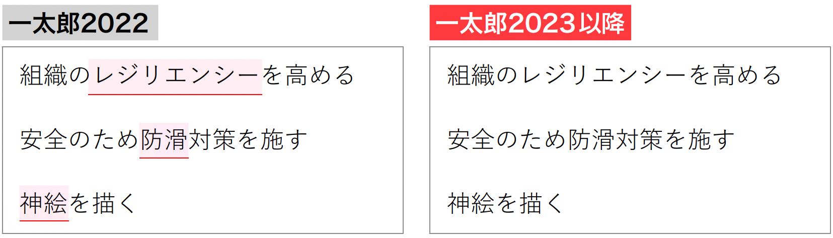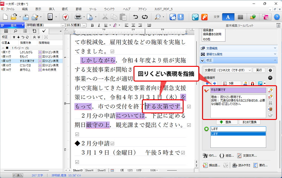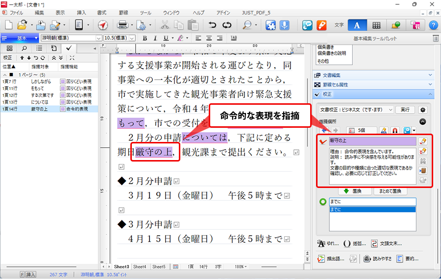 一太郎2025の文書校正では、誇張表現をチェックする機能を追加。根拠の確認を促すことで、安易な表現による社会的信用損失を未然に防ぎます。