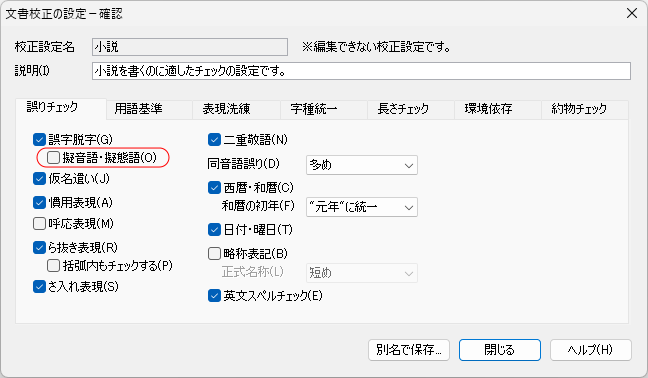 - 「文書校正:小説」の初期設定では、「擬音語・擬態語」がオフになっています。