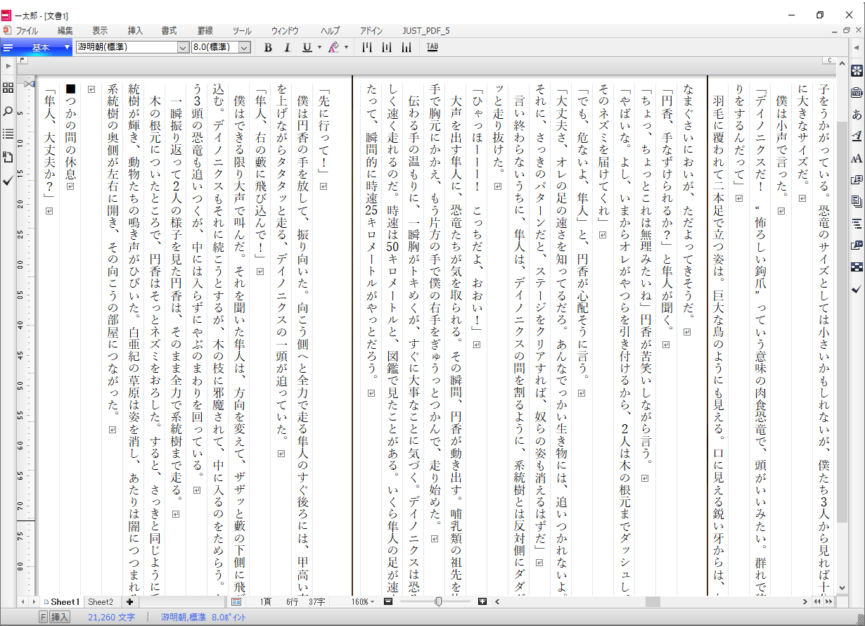 小説などの文章の、独特な作法や表現を構成する際に役立つ機能を利用できます。要望の強い、字下げチェックなどの機能も用意されています。