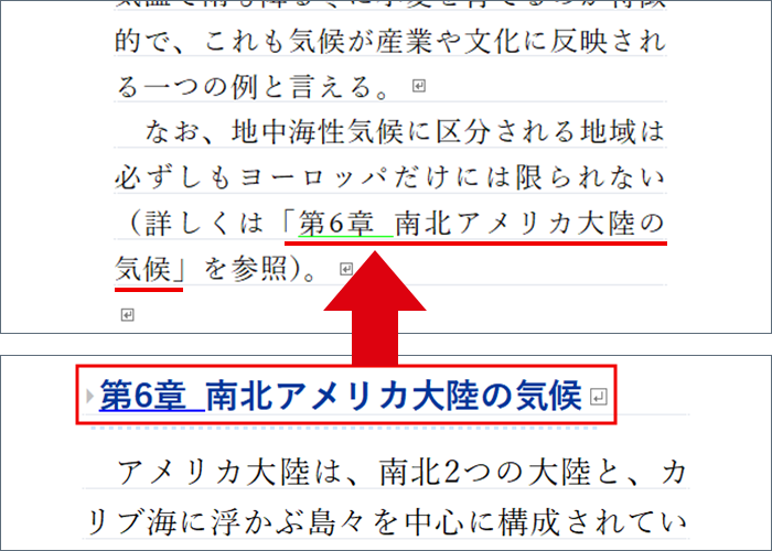 「第三章」「2.2.1」など、文書中の連番を参照して挿入する「連番参照」で、連番の後に続く文字列を自動的に挿入できます。見出しもあわせて記載したいときに、すでに記載されている見出しを効率的に追加できます。