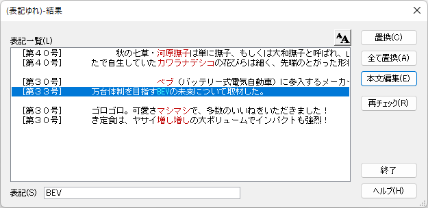頻出語のチェック結果は、ジャンプパレットに一覧表示。表示された語をクリックすると、本文中の該当箇所にジャンプするので、文章を確認しながら修正できます。