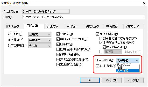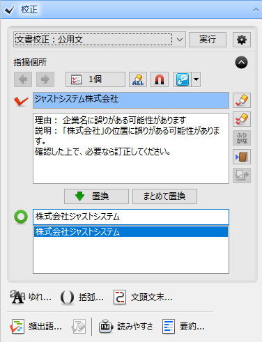 株式会社は(株)、財団法人は(財)、合資会社は(資)など、法人等の略語をチェック。混在して使用している場合にも指摘を行います。ビジネス文書の作成時に役立ちます。