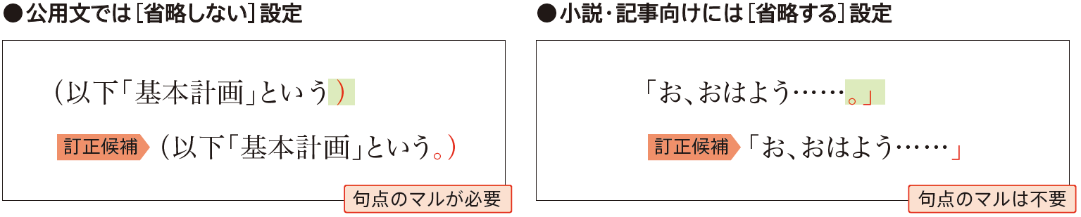 小説、記事での慣例では閉じ括弧(」)の前に句点をつけませんが、公用文ルールでは閉じ括弧の手前に句点を入れる必要があります。一太郎の文書校正では、句点を省略しない場合も指摘できるよう、設定項目をご用意しています。