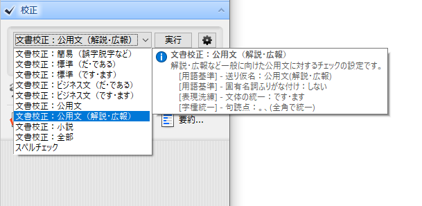 「公用文作成の考え方」では、通常の公用文で適用する基準と別に「解説・広報等」が示されています。広く一般に向けた広報誌・パンフレットでは読み手にわかりやすい表現が求められます。通常の公用文とは別に、この基準に沿った文書校正設定「公用文(解説・広報)」も利用できます。