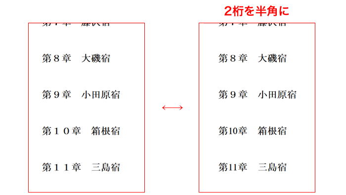 連番の挿入機能で、「第9章」までは全角数字、「第10章」以降は半角数字というように、2桁以上の連番で使用する数字を半角に設定できます。後ろに続く文字列の位置を揃える際に活用できます。