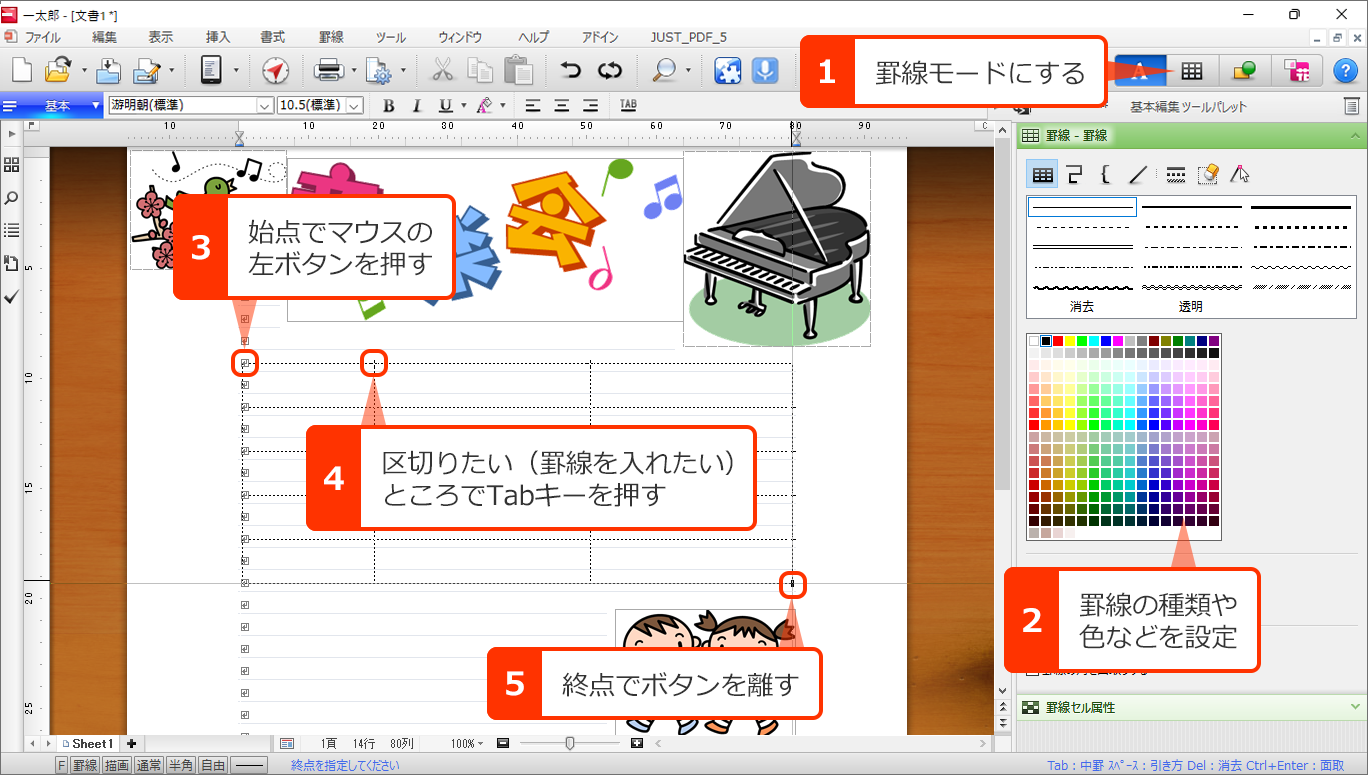 例えば、文字単位で罫線を引くことができるなど、日本人の感覚に合った操作性を実現しています。