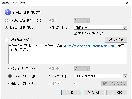 「引用」のための段落スタイルを利用可能。「出典」もスムーズに記載