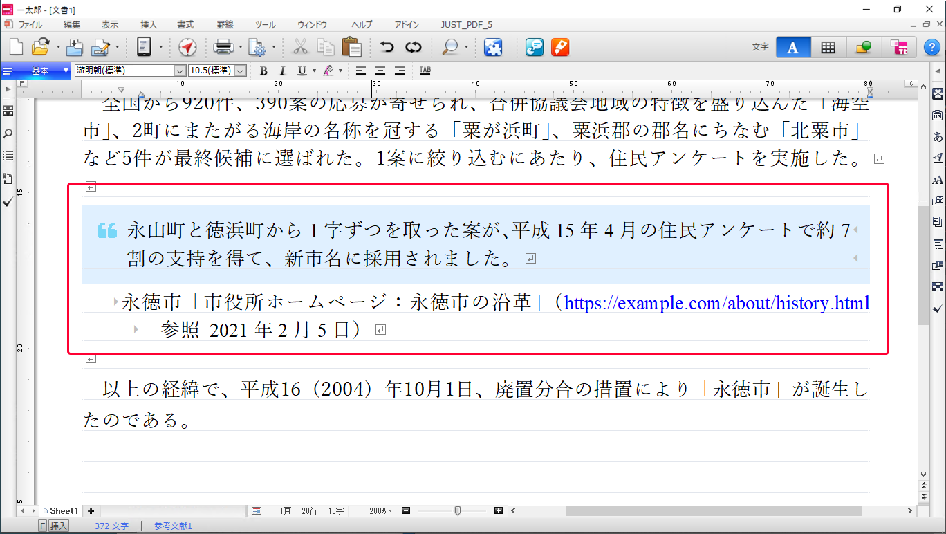 ブラウザーで文章をコピーして、一太郎で「引用として貼り付け」を選択した際に、URLや参照日を明記できる形で貼り付けます。付加情報なしの通常のテキストとして貼り付ける設定にもできます。