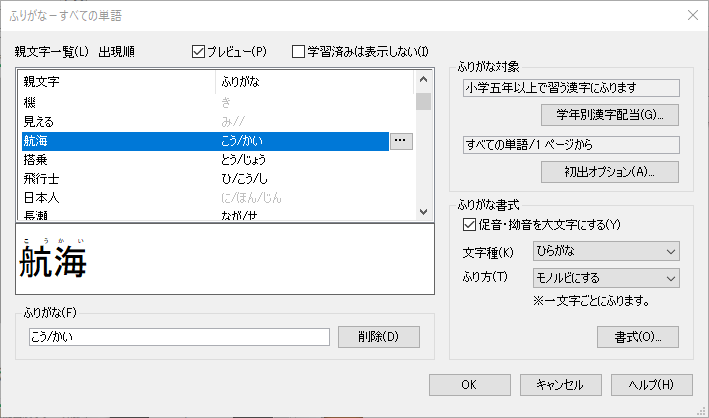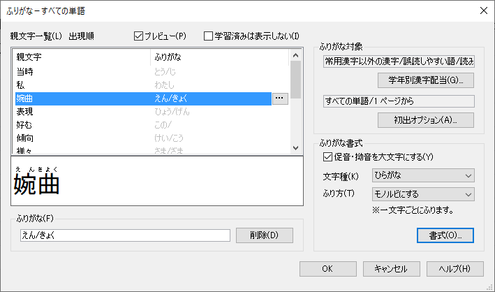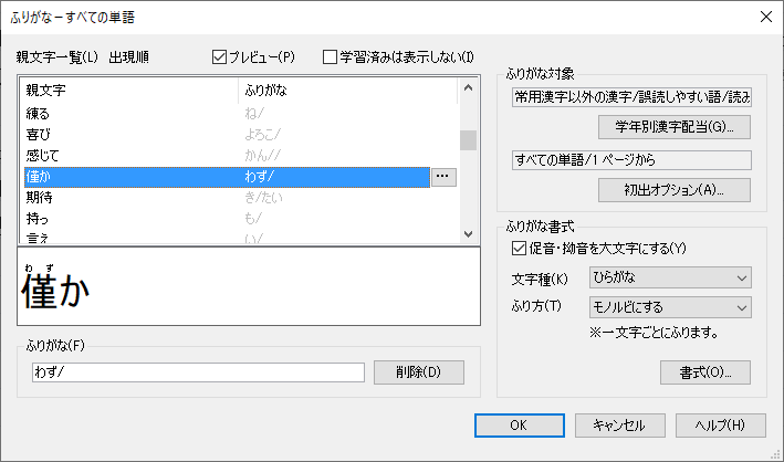誤読しやすい語を自動判別してふりがな対象とし、ふりがなを一括入力できます。例えば「幕間」(○まくあい/×まくま)、「婉曲」(○えんきょく/×わんきょく)といった誤読しやすい語、「遡る」(さかのぼる)、「笑い種」(わらいぐさ)といった読みづらい語に対してふりがなを入力できます。