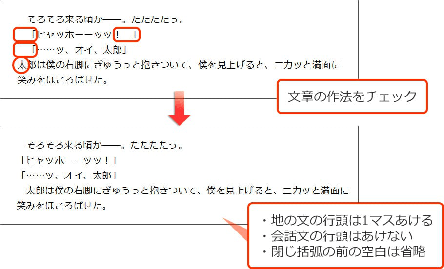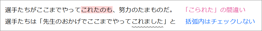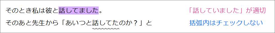 「くだけた表現」「ら抜き表現」の指摘では、「括弧内もチェックする」という設定があるため、括弧で囲まれた会話文はチェックしないで、地の文の表現だけをチェックすることができます。会話文が指摘されることもなく、文書校正が効率よく行えます。
