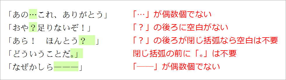 小説や商業用文章には、三点リーダ(……)やダッシュ(――)を偶数個ずつ使うなどを、作法とすることがあります。次のチェック機能を利用できます。