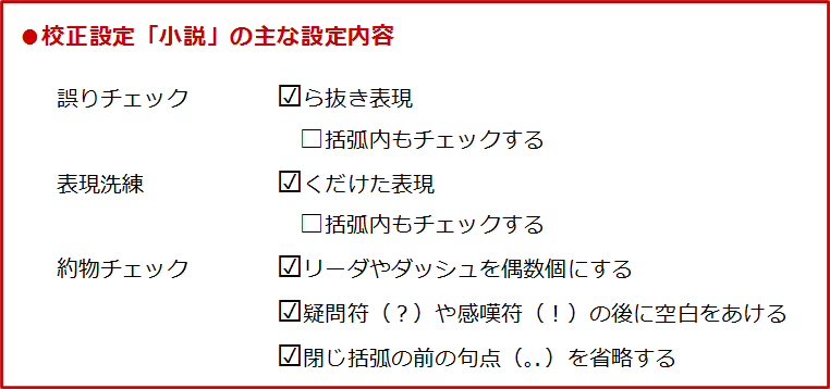 文書校正の校正設定では「小説」用の設定を利用できます。三点リーダ・ダッシュの使い方作法や、会話文・地の文での表現の書き分けなど、小説ならではの文章のチェックにお勧めの設定です。