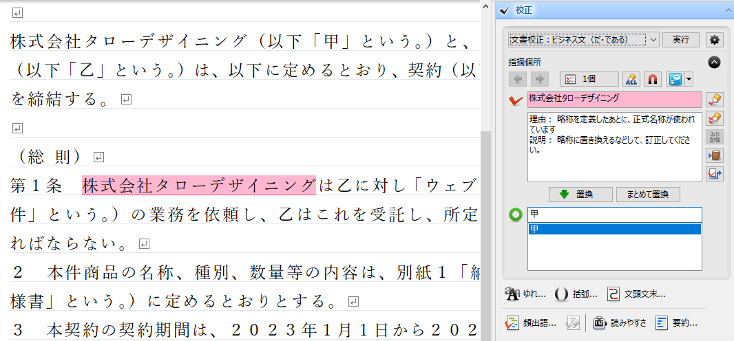 論文やレポート、リリース文書や法律文書などでは、(以下、「○○」という。)のような略称を使うことがあります。このとき、略称を定義したにもかかわらず一度も使わなかったり、略称を用いずに正式名称を使用したりするなど、整合性がとれないときにチェックされます。