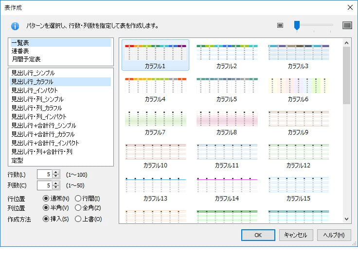 見出し行列や合計行の有無、「シンプル」、「カラフル」、「インパクト」などのジャンルからサンプルを選んで行数、列数などを指定するだけで簡単に罫線表ができあがります。