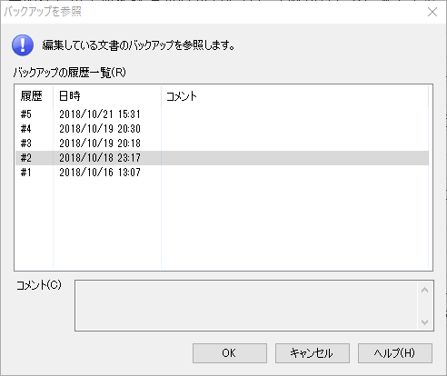 「バックアップから復元」を表示すると、自動バックアップされたファイルを一覧できます。日時を確認して、修正前の状態に戻せます。「バックアップを参照」から内容を確認したり、文書を比較しながら復元することもできます。保存し忘れた文書のバックアップを開くこともできます。