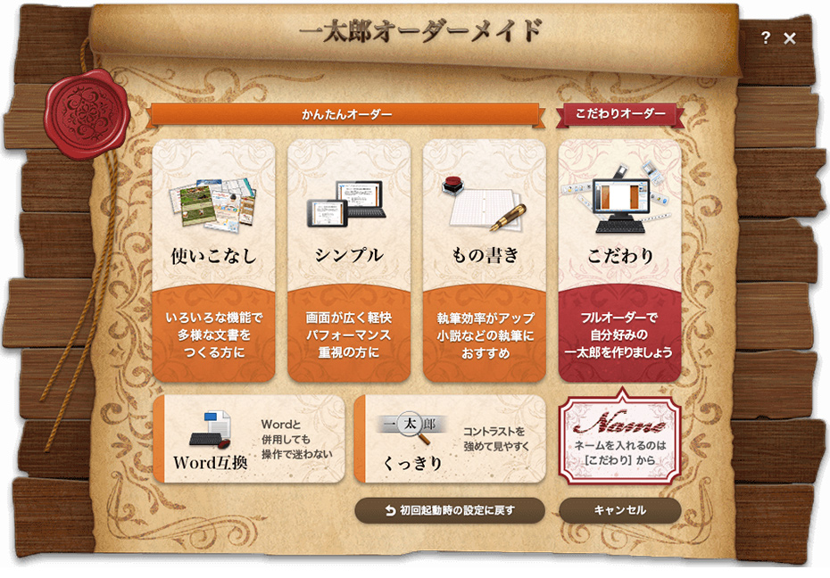 一人一人にぴったりの画面や操作環境を、オーダーメイド感覚で設定できます。一太郎からの質問に、あなたの使い方・使用機器・身体特性などに応じて答えるだけで、しっくりはまる一太郎をつくることができます。