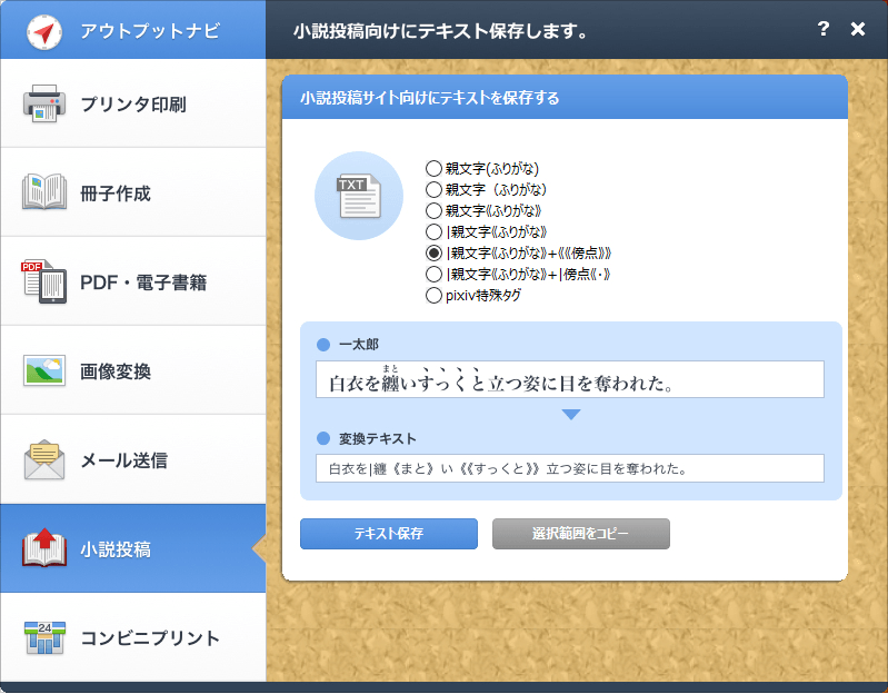 ふりがなをふった文字を、テキスト形式で保存したり、コピーしてテキスト形式で貼り付けたりすると、ふりがなは、親文字の後ろに括弧で囲まれて挿入されます。小説投稿サイトへの投稿がしやすいよう、ふりがなの形式を選択できます。傍点や改ページの出力に対応した形式もあります。