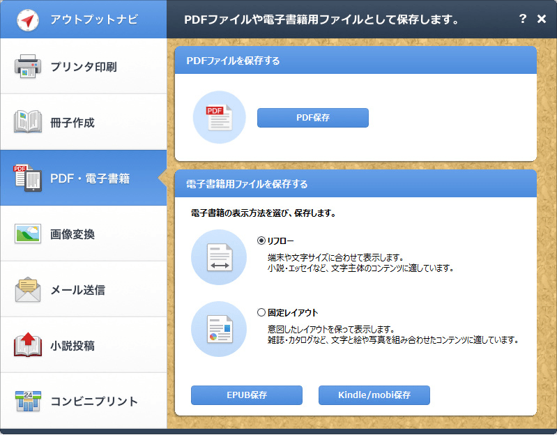 作った文書をPDF形式や電子書籍のフォーマットで保存します。そのまま印刷所に入稿したり、電子書籍として販売したりできます。