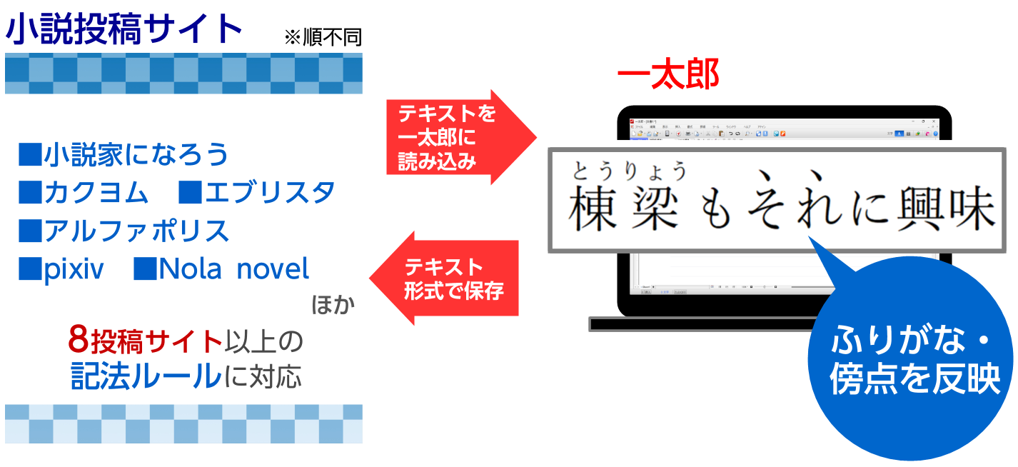 一太郎は、小説投稿サイトで修正した内容を一太郎に取り込む際、テキスト内のふりがなや傍点の形式で記述された文字列を解析し、自動的に一太郎文書上でふりがなや傍点を設定できるオプションを複数用意しています。一太郎で執筆して小説投稿サイトに投稿、という相互の連携がスムーズに行えます。