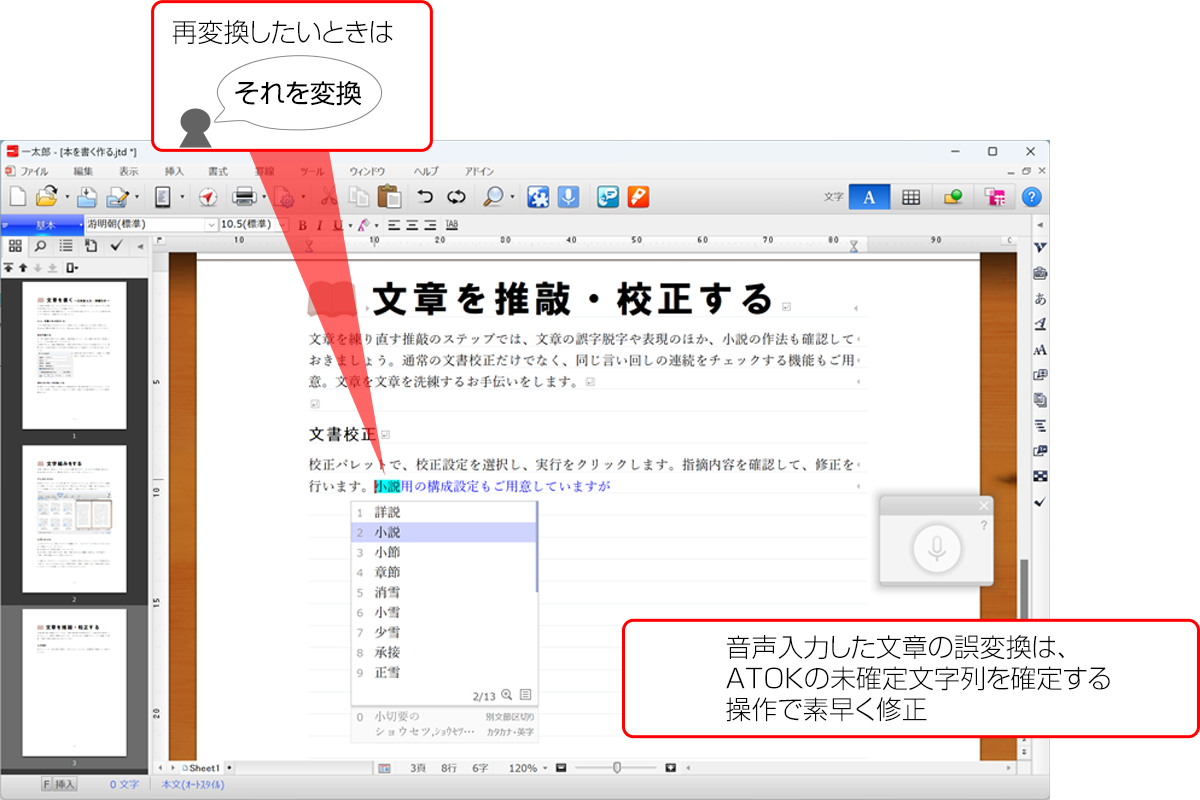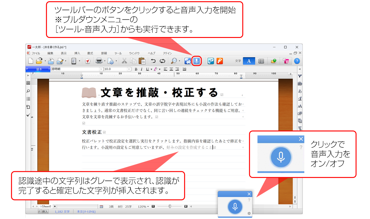 マイクを使って一太郎に音声で文字を入力する「音声入力」機能を搭載。タイピングに加えた新たな入力方法として、スピーディーに文章を「声で書き進める」ことができます。