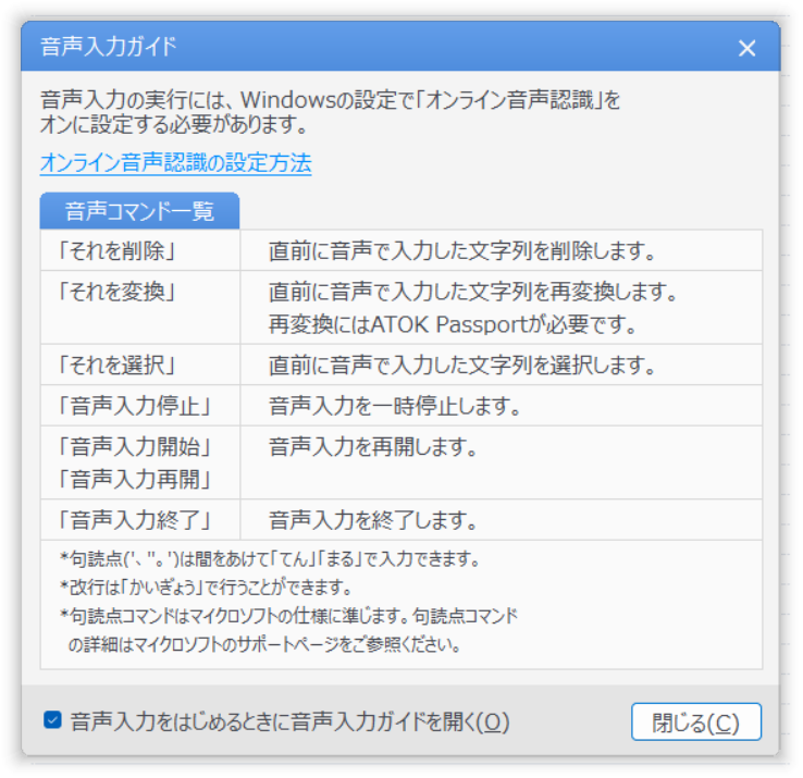テンや丸、括弧などの記号は、Windows 11の音声認識と同じ句読点コマンドが利用できます。