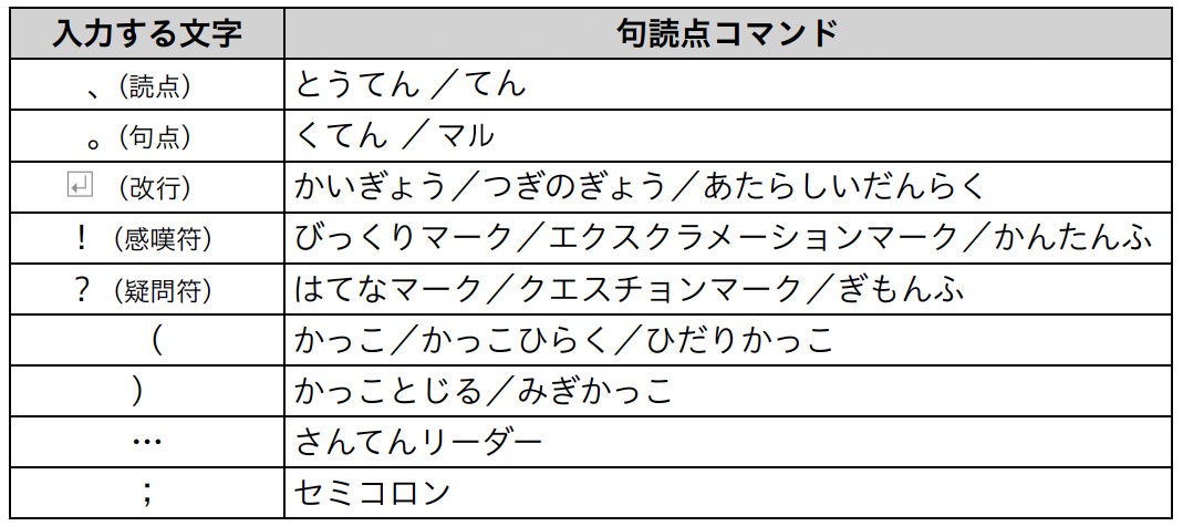オプションを使わず、これまで通りに句読点を入力したい場合には、句読点コマンドとして「てん」「まる」と発話して「、」「。」を入力できます。