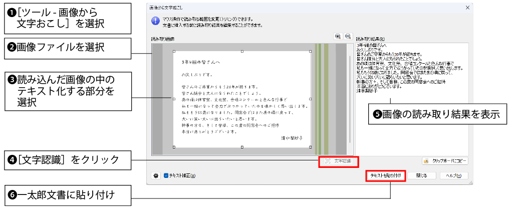 一太郎2025では、画像に含まれるテキスト情報を認識して文字データに変換するOCR(光学的文字認識)機能を搭載。テキスト化したい資料などを写真撮影し、画像ファイルとして指定するだけで、一太郎が文字データを抽出するので、これまで目視で確認しながら手動で入力していた労力が不要になります。