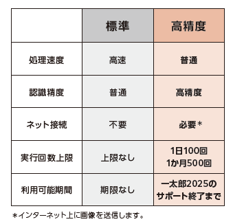 - 「画像から文字起こし」の認識精度を[高精度]でご利用するには、インターネット接続環境が必要です。また、実行回数と利用期限に制限があります。
