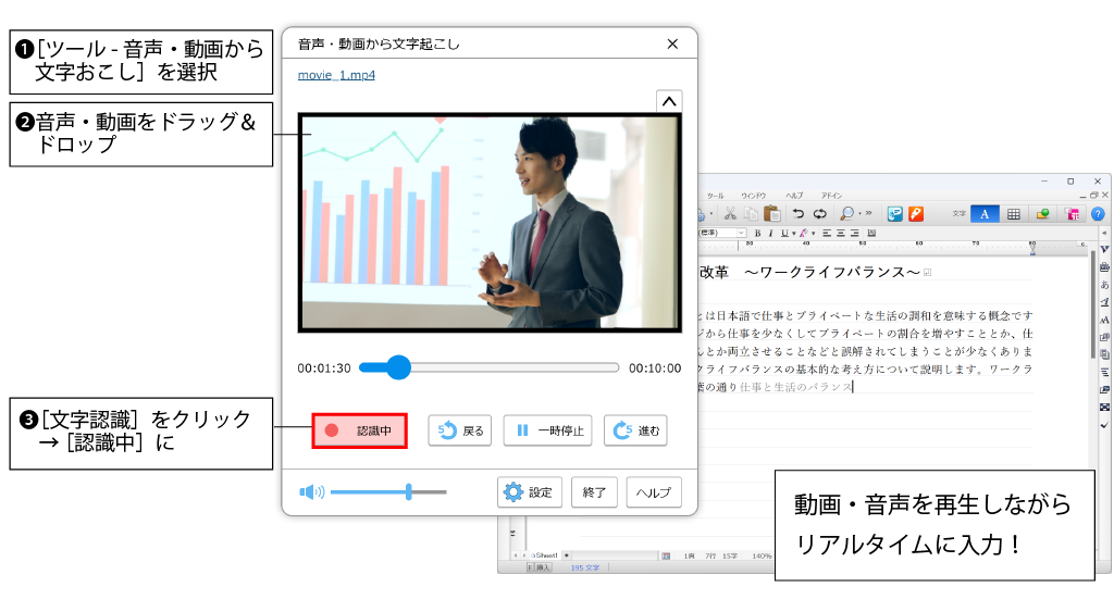 一太郎2025では、音声ファイルや動画ファイルの音声をリアルタイムで一太郎文書に入力する文字起こし機能を搭載。会議や講演、取材やインタビューなどの音声・動画データから文字を起こす時間を大幅に短縮し、効率よく文書作成が行えます。