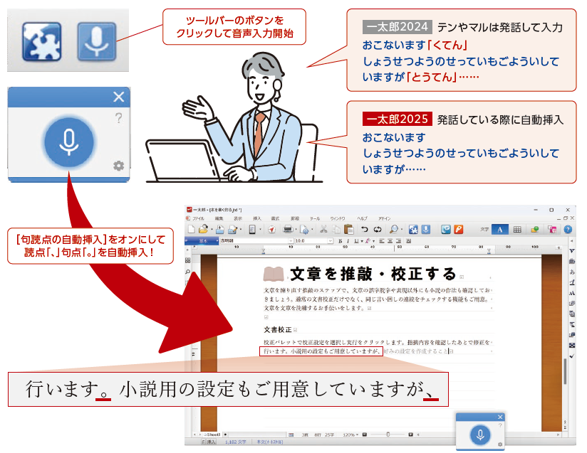 一太郎2025では、「、」を「てん」、「。」を「まる」と発話することで句読点が入力でき、より直感的な音声入力が可能となっています。