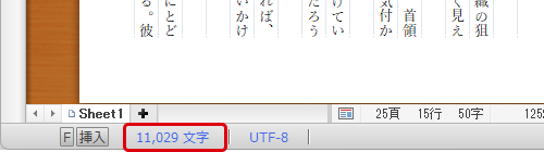 文書の文字数は、ステータスラインにも表示できます。ツールパレットを閉じて画面を広く使いたいときも、常に文字数を確認できて便利です。テキストファイルでは文字コードも表示されます。
