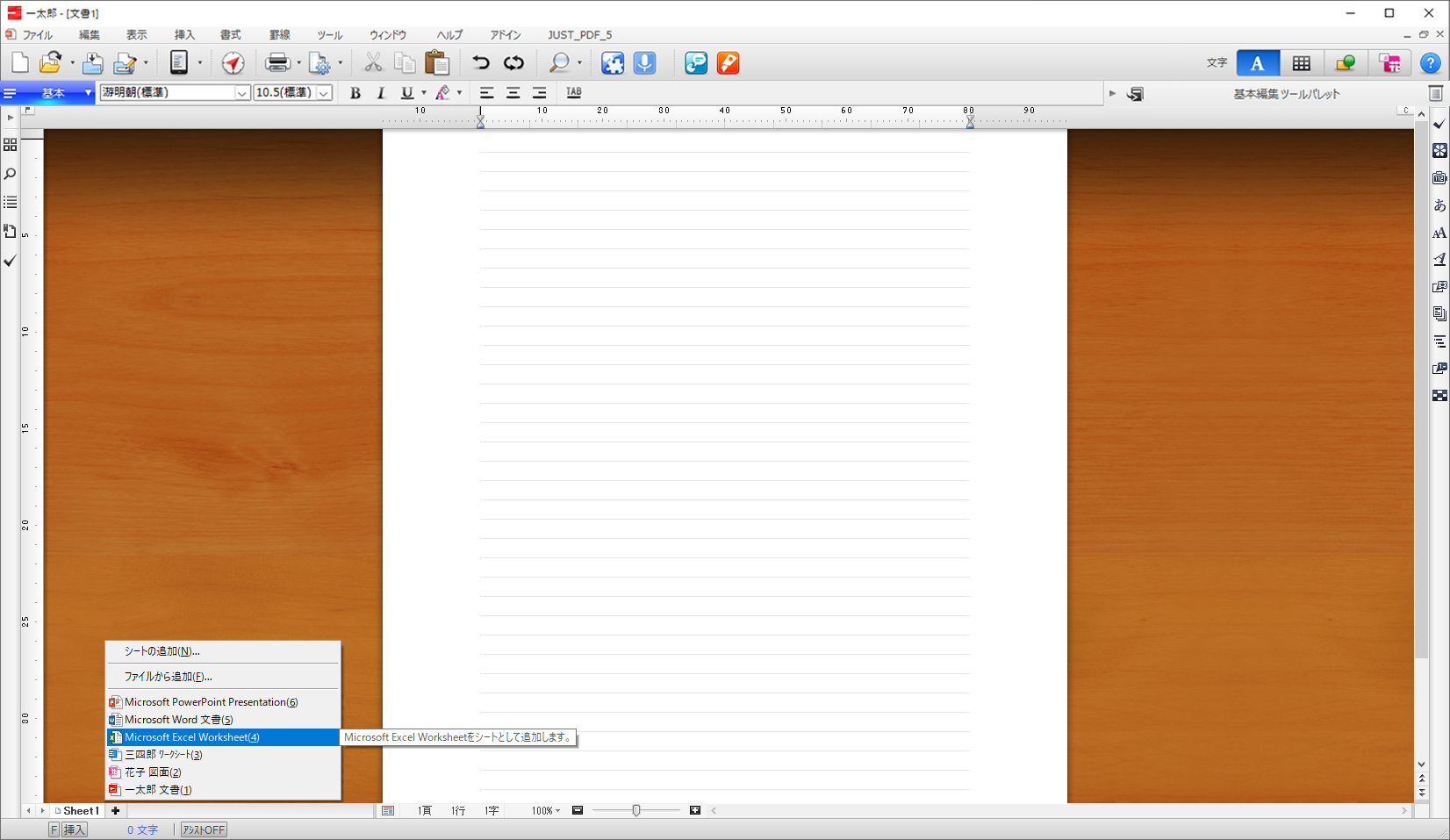 表計算のように複数の「シート」を1つの一太郎文書ファイルに保持できるので、長い文書の章ごとにシートを分けたり、一太郎形式以外のファイルを追加することもできます。