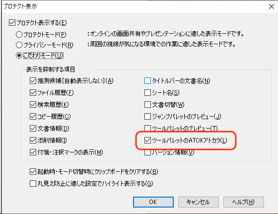 [ATOK Passport]パレットの[ATOKアトカラ]には入力した内容も表示されるため、オンライン画面共有に適さない場合があります。「プロテクトモード」で設定を行い、表示を抑制することができます。