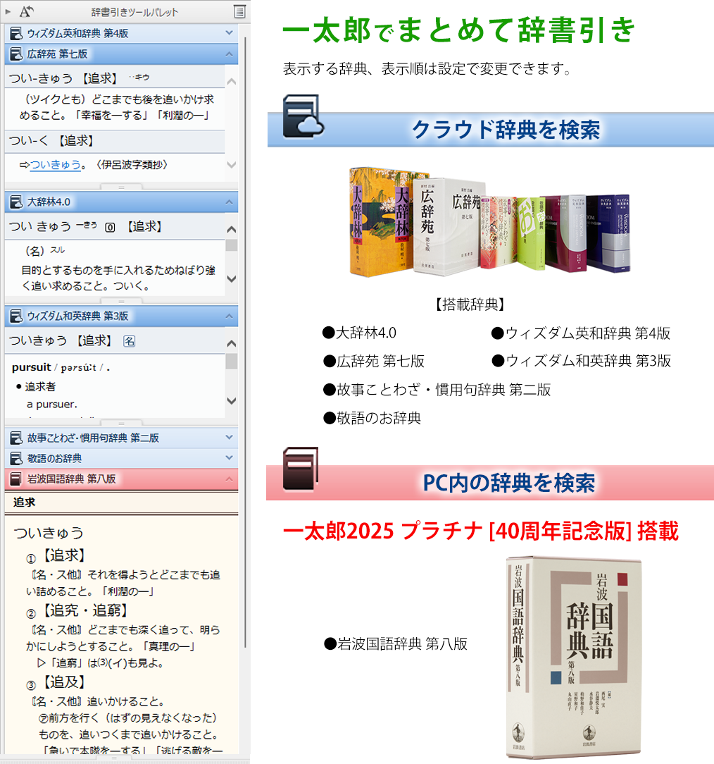 複数辞書をまとめて引ける辞書引きツールパレットは、ATOK Passport [プレミアム]で利用できる「ATOKクラウド電子辞典」にも対応しています。辞書引きの際に、クラウド経由で『広辞苑』『大辞林』などの国語辞典や、英和・和英辞典などを参照できます。