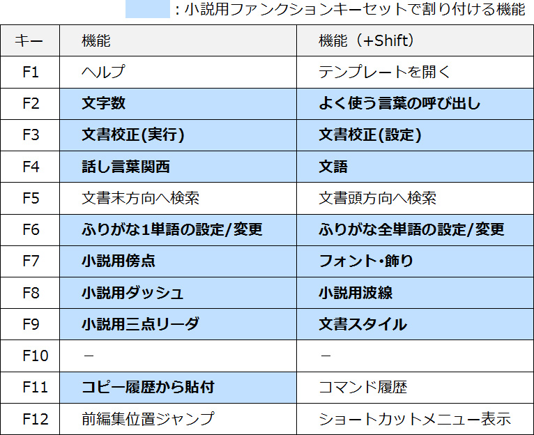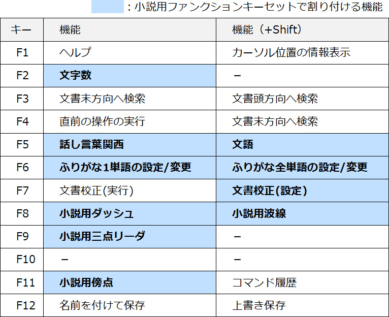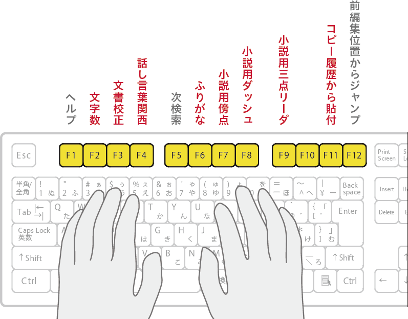 思考を妨げずに、シンプルな操作で機能を実行できるよう、小説執筆用の特別なファンクションキーセットをご用意しました。 小説特有の入力や傍点付加をスムーズに行え、マウスへの持ち替えをできる限り減らすことにこだわったキーセットです。